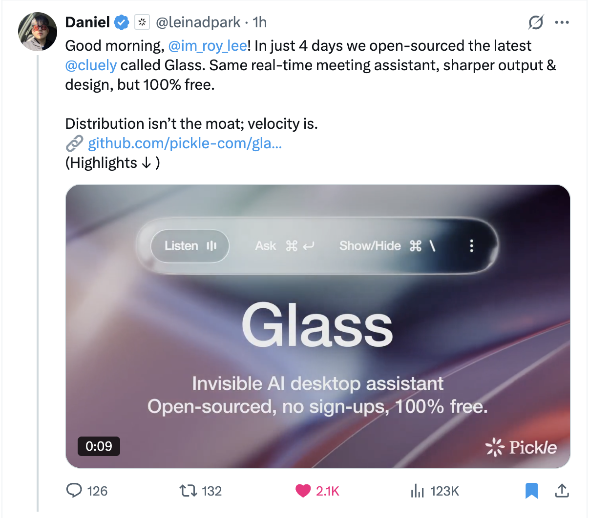 If that sounds familiar, it’s because that’s exactly what Cluely does. But while Cluely charges $20/month just to view past notes, Glass is completely free and open source.